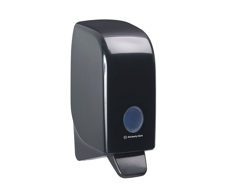 Dispenser pentru sapun lichid fabricat din plastic ABS, rezistent, prevazut cu fereastra pentru vizualizarea cantitatii de sapun disponibile;