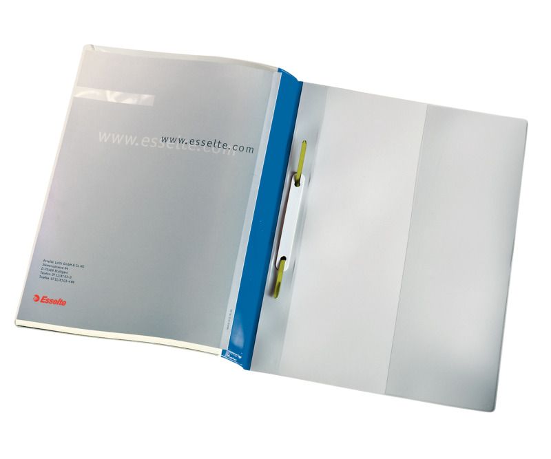 Acest dosar are un sistem de sina care permite utilizatorului să adauge sau să îndepărteze cu ușurință documentele. Dosarul cu sina Esselte Panorama plastic albastru este fabricat din PVC rezistent și are o capacitate mare de stocare de pana la 250 de coli, fiind ideal pentru utilizarea zilnică în birouri sau acasă. De asemenea, este prevăzut cu un buzunar frontal pentru etichetare și organizare mai ușoară.