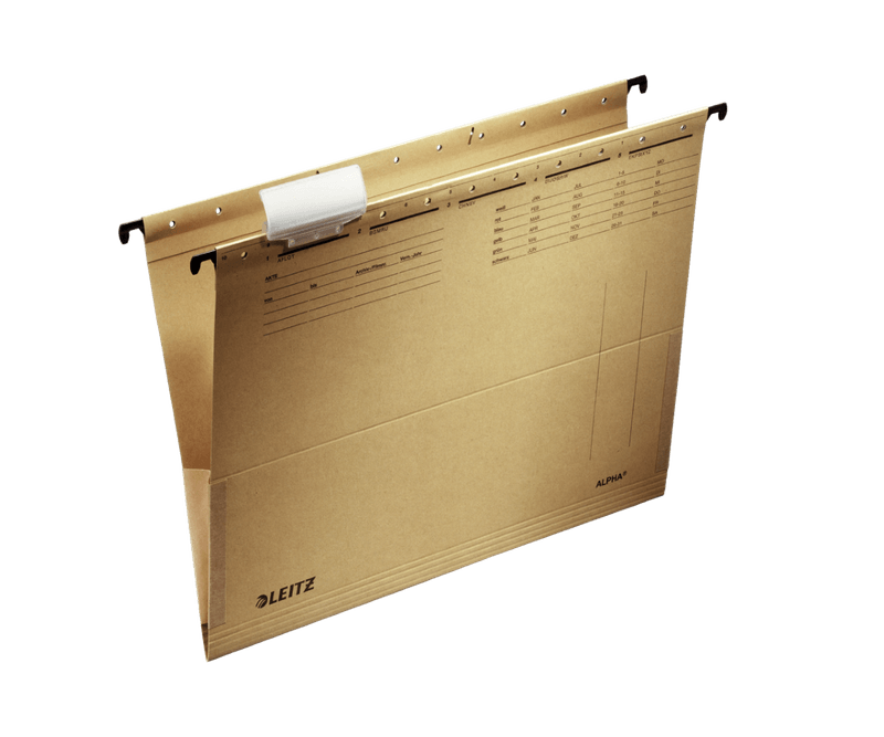 Dosar suspendabil Leitz Alpha cu burduf natur este un instrument de birou folosit pentru a organiza și depozita documente. Acest dosar de carton 250 grame/mp este conceput pentru a fi suspendat într-un sertar de birou sau într-un dulap pentru a economisi spațiu și pentru a permite o accesibilitate ușoară la documente. Acesta include și un suport pentru etichete pentru a putea fi identificat și accesat cu ușurință. Cartonul din care este realizat acest dosar este 100% reciclat si certificat Blue Angel. Eticheta Blue Angel a fost lansata in Germania si este prima eticheta de mediu din lume pentru produse si servicii. Inca din 1978 promoveaza principiile sustenabilitatii si ghideaza consumatorii catre produsele ecologice. Certificarea atesta faptul ca in procesul de productie se economisesc resurse si se protejeaza mediul. |