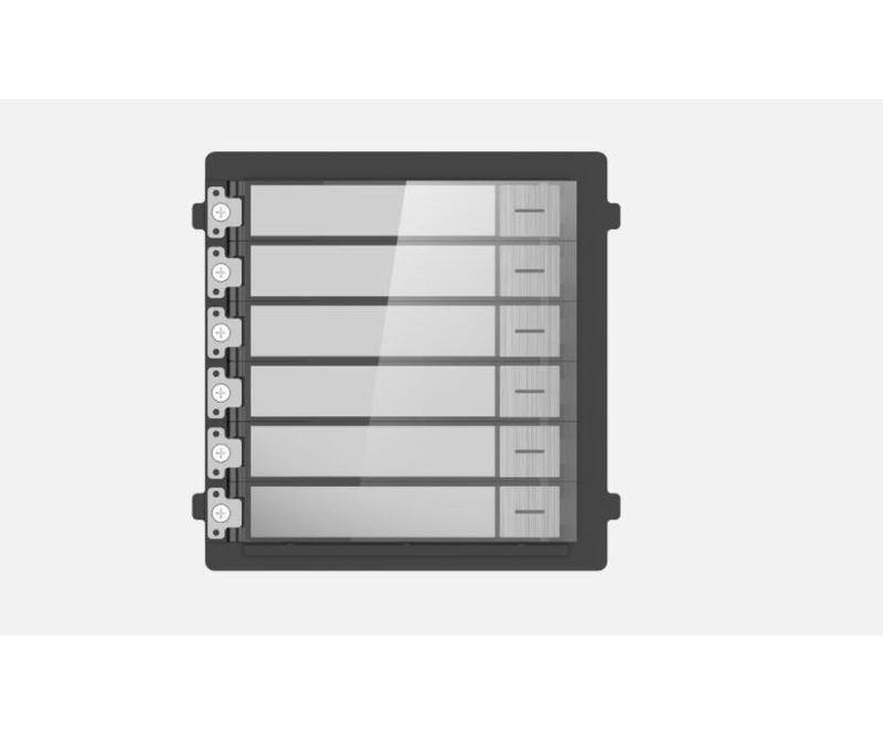 Modul de extensie videinterfon cu sase butoane de apelare Hikvision DS- KD-KK/S; montaj aplicat sau ingropat (acesoriile de montaj nu sunt incluse), customizare afisare nume; iluminare pe timp de noapte; Conectare RS-485, 1 x Input; 1 x Output; protectie: IP 65; material otrel inoxidabil, dimensiuni: 98.21 mm x 100.21 mm x 33.7 mm; Temperatura de functionare:-40°C to +60°C;