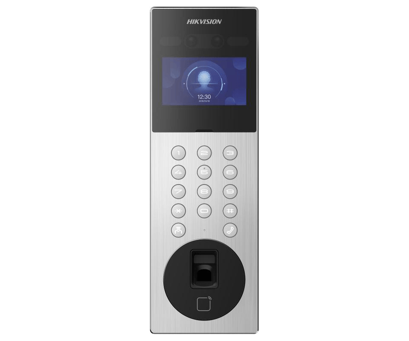 Post exterior videointerfon IP Hikvision DS-KD9203-ME6, recunoastere faciala, pin, card, 10000 de utilizatori, ecran LCD 800 × 480px, IP65, instalare aparenta, alimentare: 12 VDC, 1.5 A, dimensiuni: 373 mm × 124 mm × 43.7 mm, greutate: 0.405kg, temperatura de functionare: -30 °C to 60 °C.