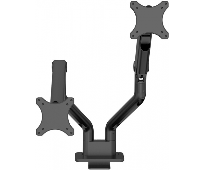 Brat dublu pentru monitor Neomounts, tip full motion, pentru display-uri cu diagonale 17-35, sistem de prindere VESA 75x75~100x100mm, greutate maxima suportata 18kg per ecran, tilt +90°, -90°, swivel +90°, -90°, rotate +180°, -180°, reglabil pe inaltime 20,2-52,2 cm, ajustarea latimii 115.9 cm, ajustarea adancimii 8.8-62.5 cm, aluminiu, culoare negru. Garantie 10 ani