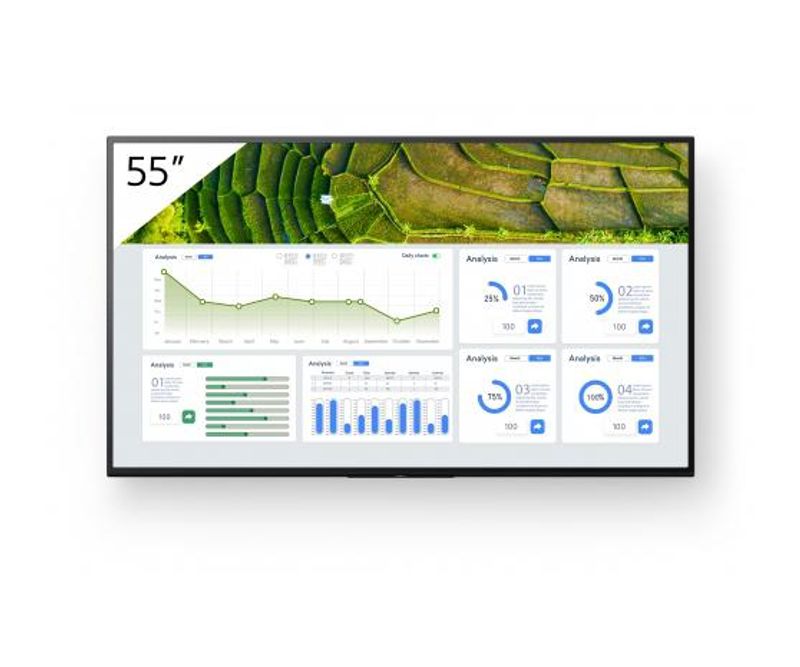 Monitor signage Sony BZ30L, 55, 440nit, 24/7, UHD, panel IPS, D-LED, 8ms, contrast static 1200:1, contrast dinamic 300000:1, matuire 1%, Android 10, stocare 16GB. Miracast, Chromecast built-in, AirPlay, Apple HomeKit, Google Play Store. Conectivitate: WiFi (2.4GHz, 5GHz), BT 4.2, 1xComposit, 4xHDMI, HDCP2.3, 2xUSB, 1xLAN, 1xRS232C, Light sensor, 1xAudio In, 1xAudio Out, 1xHeadphone Out. Landscape & Portrait, boxe 2x10W, culoare negru, dimensiuni 124.3x72.1x7.1 cmmm, VESA 300x300, greutate 15.7kg, consum tipic 202W. Garantie 3 ani