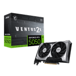 MSI GEFORCE RTX 5050 8G VENTUS 2X OC. Graphics processor family: NVIDIA, Graphics processor: GeForce RTX 5050. Discrete graphics card memory: 8 GB, Graphics card memory type: GDDR6, Memory bus: 128 bit. Maximum resolution: 7680 x 4320 pixels. DirectX version: 12 Ultimate, OpenGL version: 4.6. Interface type: PCI Express x16 5.0. Cooling type: Active, Number of fans: 2 fan(s)