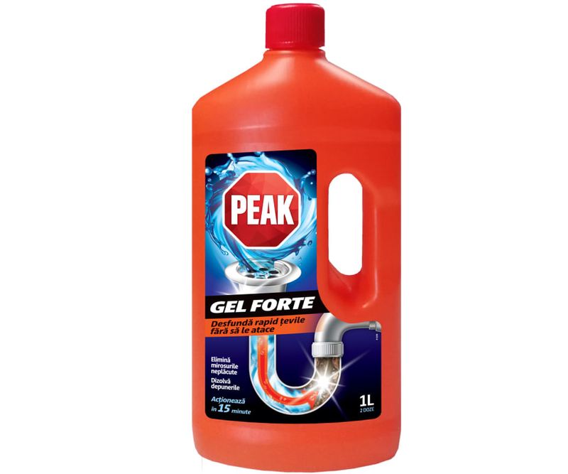 Peal gel forte desfunda rapid si fara efort tevile, sifoanele si scurgerile de la chiuvete, cazi. Elimina mirosurile neplacute si dizolva depunerile. Actioneaza in 15 minute. Produs fabricat in Romania.