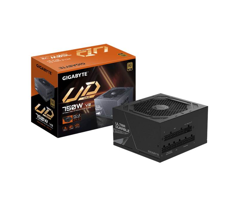 GIGABYTE UD750GM PG5 V2. Total power: 750 W, AC input voltage: 100 - 240 V, AC input frequency: 50/60 Hz. Motherboard power connector: 20+4 pin ATX, Motherboard power cable length: 61 cm, SATA power cable length: 150,600 mm. Purpose: PC, Power supply unit (PSU) form factor: ATX, 80 PLUS certification: 80 PLUS Gold. Product colour: Black, Cooling type: Active, Fan diameter: 12 cm. Width: 150 mm, Depth: 140 mm, Height: 86 mm
