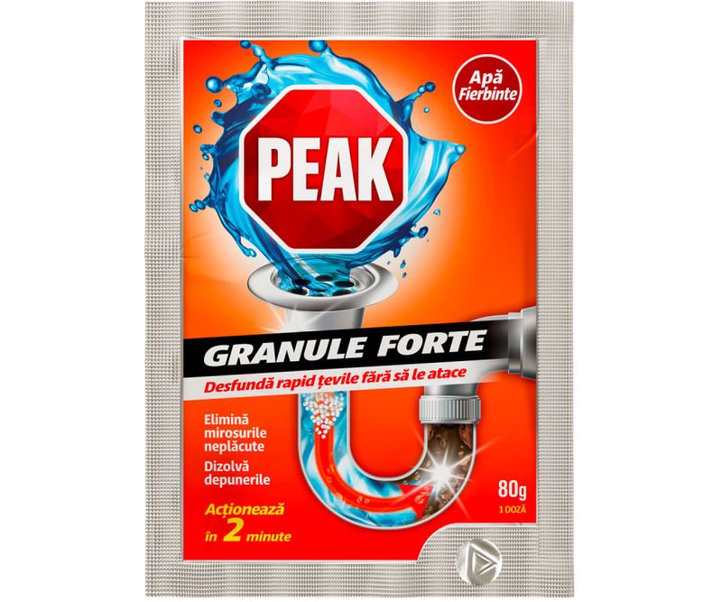 Peak granule forte pentru apa fierbinte desfunda rapid si fara efort tevile, sifoanele si scurgerile de la chiuvete, cazi. Nu ataca tevile si sifoanele din plastic si metal. Elimina mirosurile neplacute si dizolva depunerile. Actioneaza in 2 minute.
