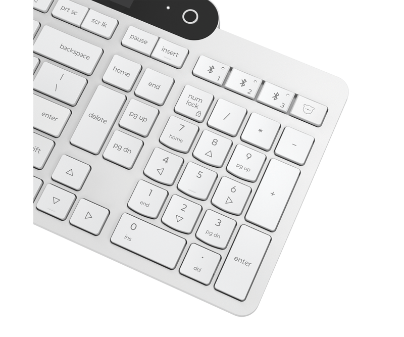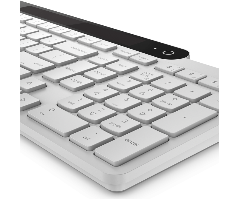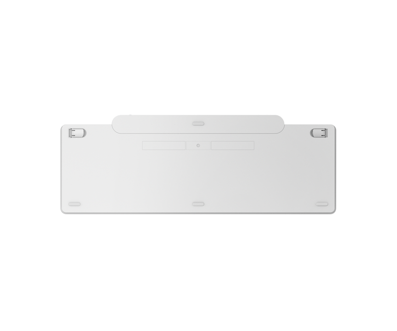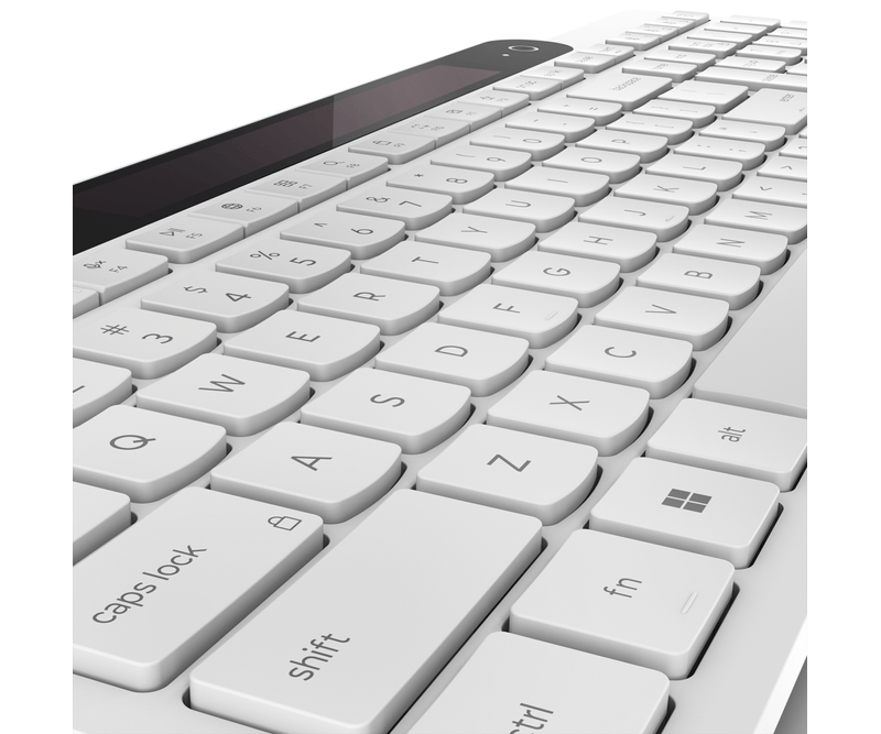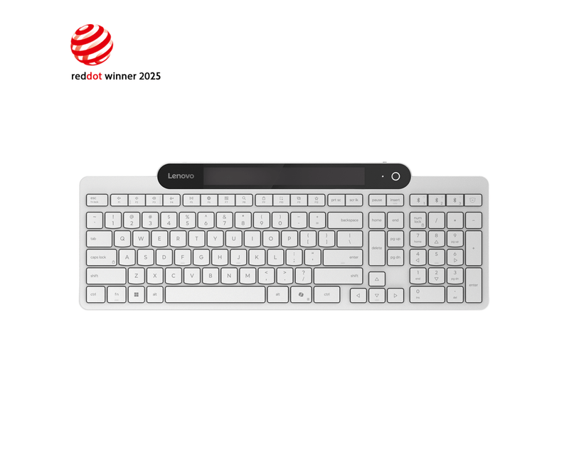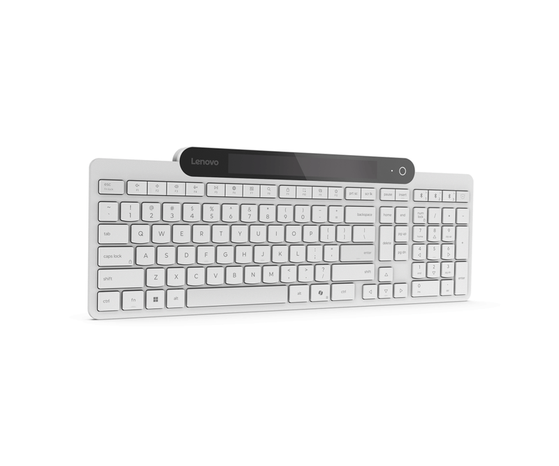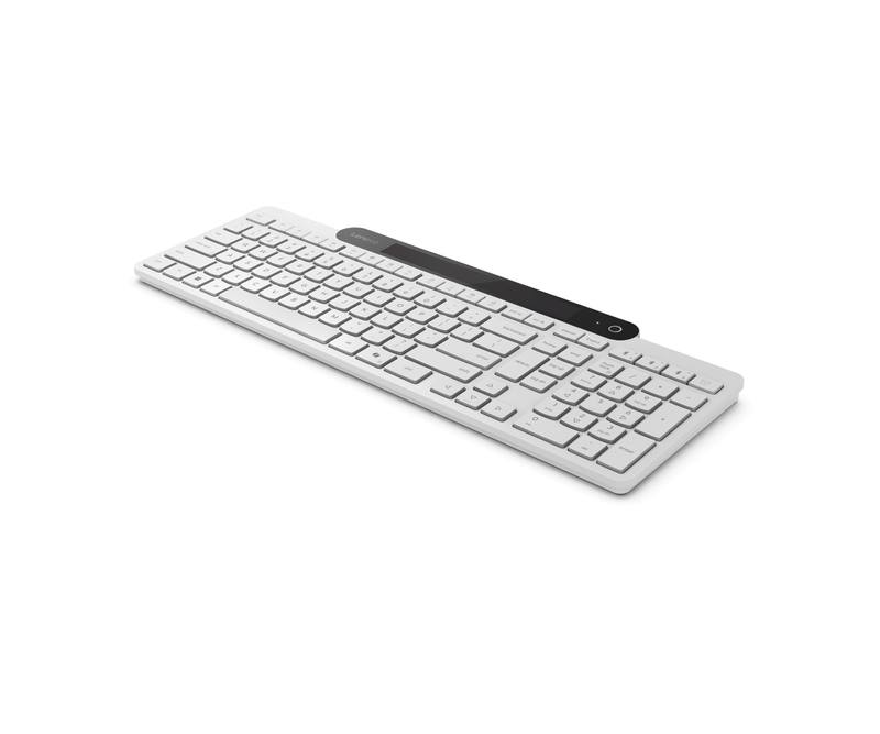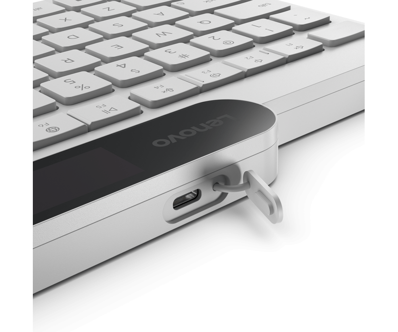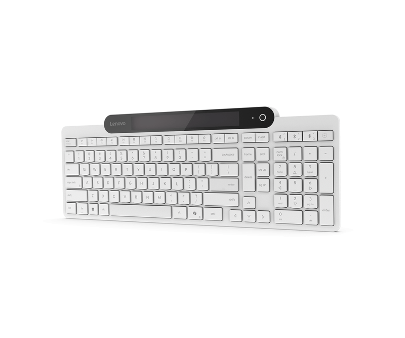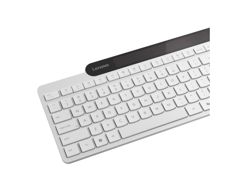 Tastatura Lenovo 800 Self-Charging Bluetooth; reincarcabila cu ajutorul luminii ambientale, fara spatiu destinat bateriilor clasice; layout: US; conectivitate: BT 5.1, se poate conecta la 3 dispozitive; greutate: 635g; compatibil cu Windows 10, Windows 11; culoare: alb