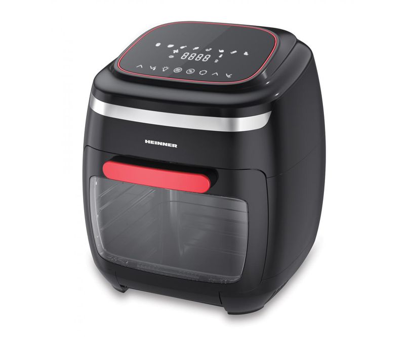 Friteuza cu aer cald Heinner HAF-B2000FB, putere: 2000W, capacitate cuptor: 11L, capacitate cos de preparare: 4.5L, panou de comanda tactil, 8 programe de preparare, temporizator: 4h, temperatura reglabila: 30- 200°C, tava pentru scurgerea uleiului, 3 rafturi pentru preparare cu aer cald, tija rotisor, maner pentru rotisor, oprire automata, picioare antialunecare