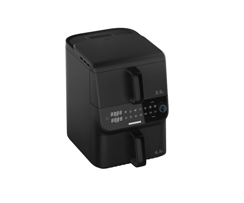 FRITEUZA CU AER CALD DUBLA ETAJATA HEINNER HAF-C10DBS25BK, 2500W (1000+1500W), CAPACITATE: 10L (3.5+6.5L), TEHNOLOGIE CIRCULARE RAPIDA A AERULUI CALD, CAVITATE METALICA, CONTROL DIGITAL + BUTON ROTATIV SELECTARE PROGRAME, FUNCTII: SMART + DUAL COOKING, TEMPERATURA 80-200 GRADE C, TIMER 60 MIN, 10 PROGRAME PRESETATE, COSURI INVELIS ANTIADERENT, OPRIRE AUTOMATA, NEGRU