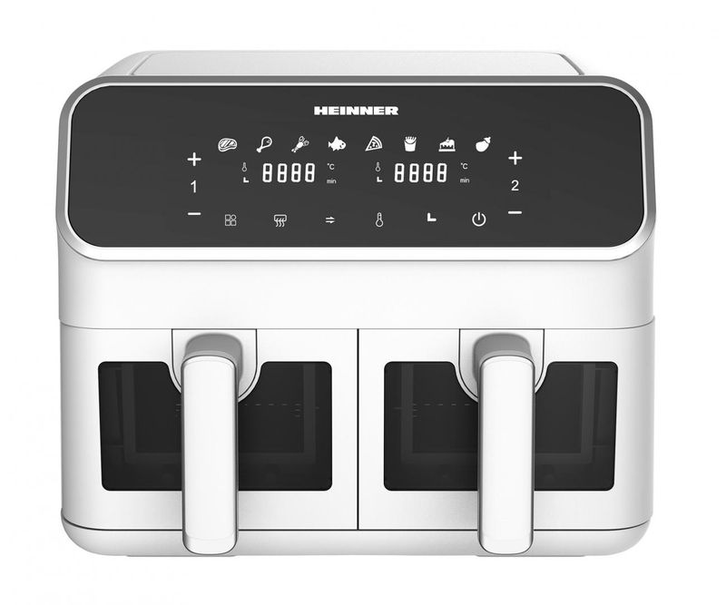 FRITEUZA DUBLA CU AER CALD HEINNER HAF-H8DBWH17, 1700W, CAPACITATE TOTALA: 8L, DISPLAY DIGITAL SI CONTROL TOUCH, CONTROL INDIVIDUAL, 8 PROGRAME PRESETATE, TEMPERATURA 80-200 GRADE, FUNCTII SYNC & MATCH, FERESTRE SUPRAVEGHERE, AUTOTOPRIRE, INVELIS ANTIADERENT COSURI SI SUPORT, ALB