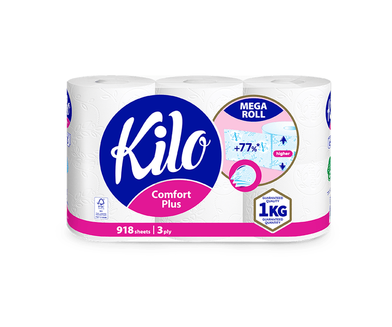 Hârtie igienică în 3 straturi KILO Confort, rezistentă și fină, neparfumată, produsă din hârtie de foarte bună calitate și ambalată în 6 role compacte, care cântăresc întotdeauna EXACT 1kg