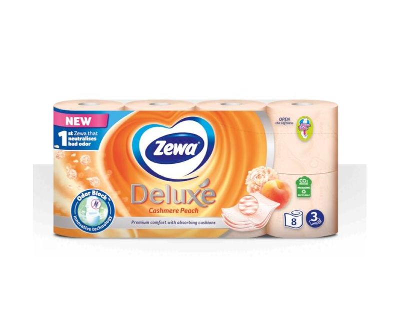 Hârtia igienică Zewa Deluxe Cashmere Peach reprezintă echilibrul perfect între rezistență și confort. Nu este nevoie sa faci compromisuri, cele trei straturi îi conferă rezistența necesară pentru utilizarea de zi cu zi, în timp ce textura fină oferă confortul delicat pentru familiile preocupate de îngrijirea pielii. Iar cu noua tehnologie OdorBlock™, parfumul ajută la eliminarea mirosurilor neplăcute¹ din baie.