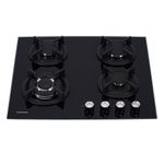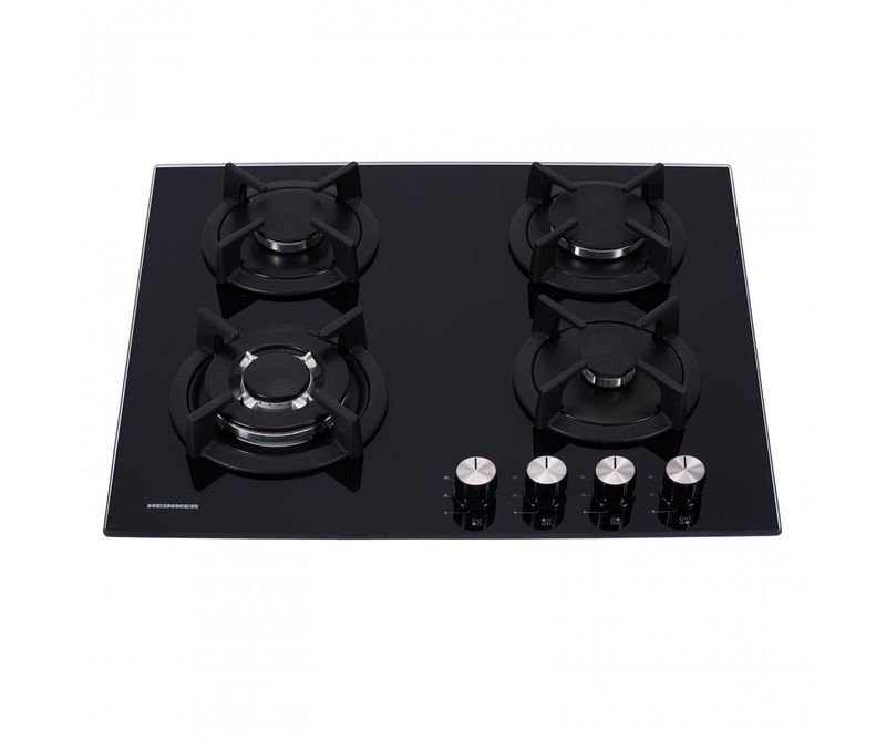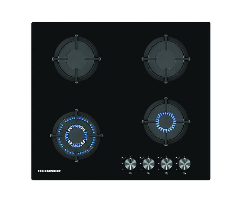 Plita incorporabila Heinner HBH-S584WI-GBK, Gaz, 4 arzatoare, Wok, Gratar fonta, Control frontal, Arindere electrica, Dispozitiv de siguranta, Duze GPL incluse, Dimenziuni (LxA): 59x52 cm, Culoare: Sticla Neagra