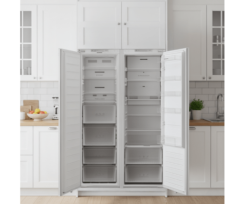 Frigider incorporabil Heinner HF-BIM304NFINVE++, No Frost, clasa energetica: E, compresor Inverter, capacitate totala: 304L, panou de control cu leduri, control electronic, functie Super racire, compartiment pentru fructe si legume cu control nivel umiditate, compartiment fructe si legume, 5 rafturi din sticla, lumina LED, alarma usa deschisa, usa reversibila, dimensiuni (LxAxI): 54 x 55 x 178.5 cm