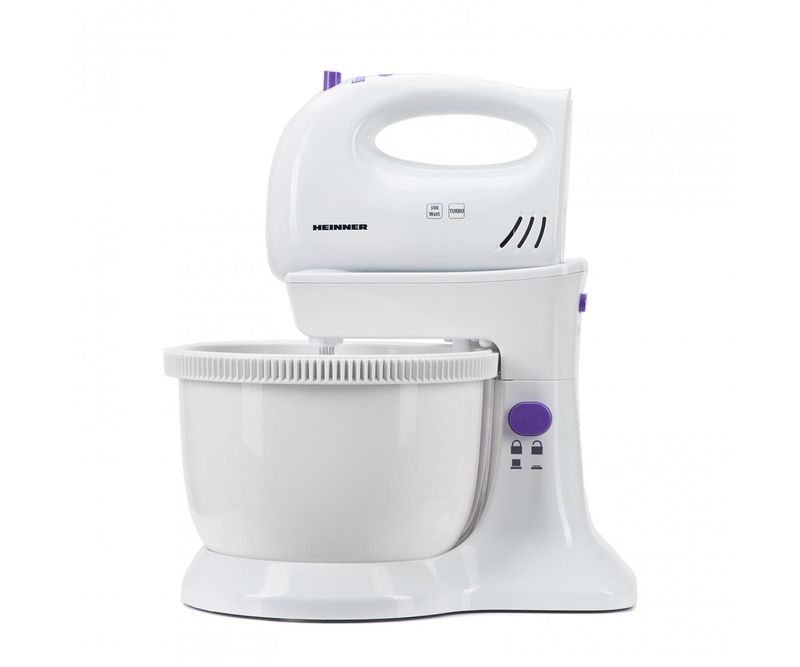 Mixer cu bol Heinner HMB-350UV, putere: 300W, 5 viteze+turbo, bol rotativ: 2.5 l, accesorii din inox: 2 teluri + 2 carlige pentru framantare, buton ejector cu dispozitiv de siguranta, buton eliberare mixer de mana, culoare: ultraviolet