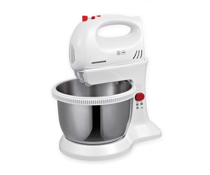 Mixer cu bol Heinner HMBR-300W, Bol rotativ din inox, capacitate: 3.4 L putere: 300W, 5 viteze+Turbo, buton de blocare, accesorii: palete pentru framantare si teluri din inox