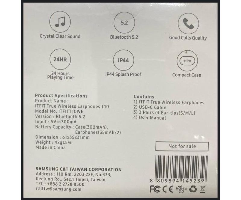 Samsung ITFIT True Wireless In-Ear Buds T10 White (BT5.2, IP44, 24Hrs autonomy, USB-C cable, S/M/L eartips) (garantie doar la NOD)