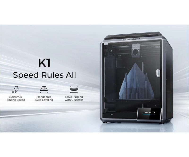 Imprimanta 3D Creality K1, Tehnologie FDM, viteza printare 600mm/s, Precizie 100 +/-0.1mm, Diametru filament: 1.75mm, tip filament compatibil: ABS/PLA/PETG/PET/TPU/PA/ABS/ASA/PC/PLA-CF/PA-CF/PET-CF, Transfer fisier: USB drive,WIFI temperatura duza:300 C, Format: STL/OBJ/AMF,Software: Creality Print, compatibil cu Cura, Simplify 3D, PrusaSlicer, Printing Size 220*220*250mm, dimensiuni: 355*355*480mm, greutate pachet : 16 kg, dimensiuni pachet 415*415*550mm, Sursa 350W.Display 4.3 touchscreen, auto leveling.