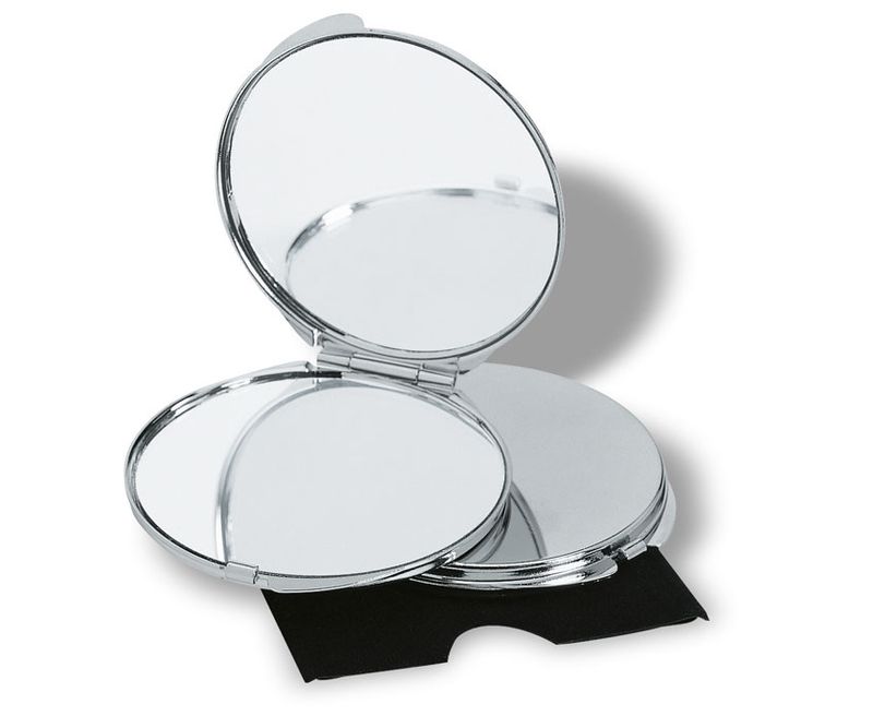 Oglinda dubla: o parte simpla si o parte care mareste. In husa de catifea.