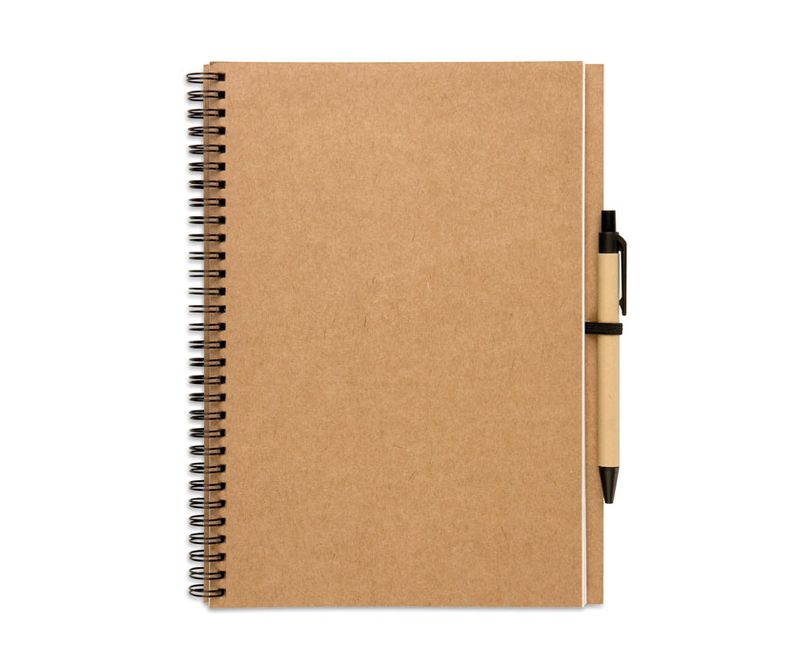Carnet din hartie reciclata cu pix si spirala. 140 de pagini simple (70 de file) din hartie reciclata. Bucla elastica neagra pentru pix. Pix din carton reciclat si accesorii din plastic biodegradabil. Mina albastra. FSC MIX CREDIT | P7.1 | FSC-C213206