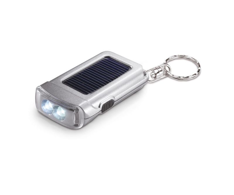 Breloc cu lanternă, de culoare argintiu satinat, cu 2 LED-uri albe. Funcţionează cu energie solară, care este stocată în acumulator ca într-o baterie normală.