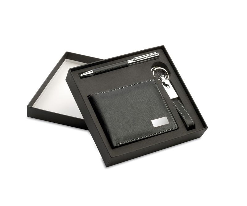 Set cadou elegant oferit pe suport din material EVA in cutie de carton. Include un pix cu deschidere prin rasucire si mina albastra, un breloc din metal cu curelusa PU si un portmoneu din PU, finisate cu cusaturi contrastante.