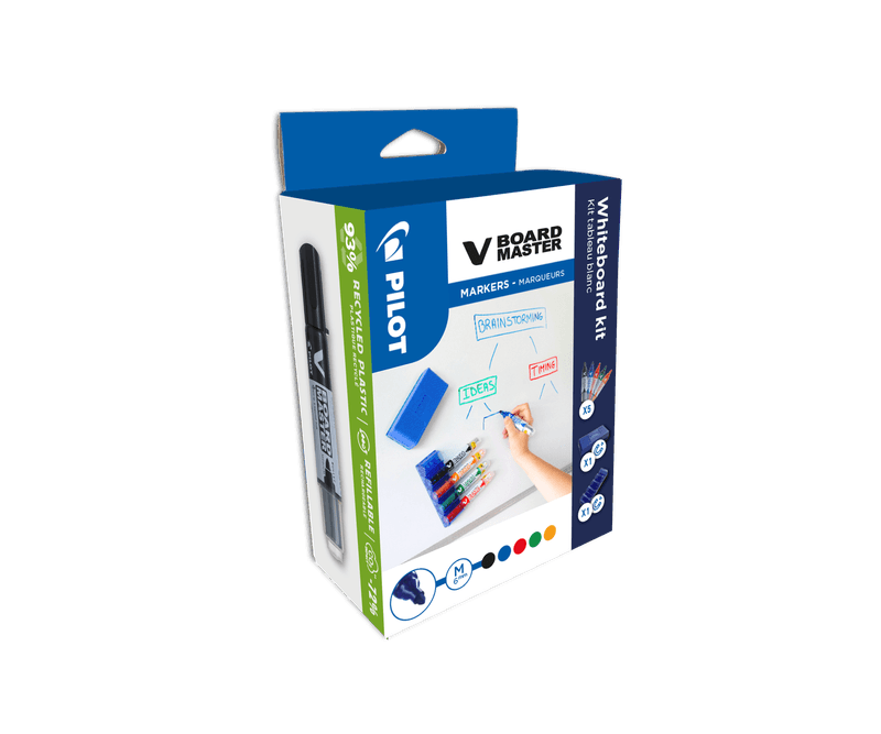 - Kitul constă în 5 markere pentru tablă Pilot VBoard Master: albastru, negru, roșu, verde, portocaliu, 1 suport magnetic pentru cele 5 markere și 1 burete pentru tablă.
