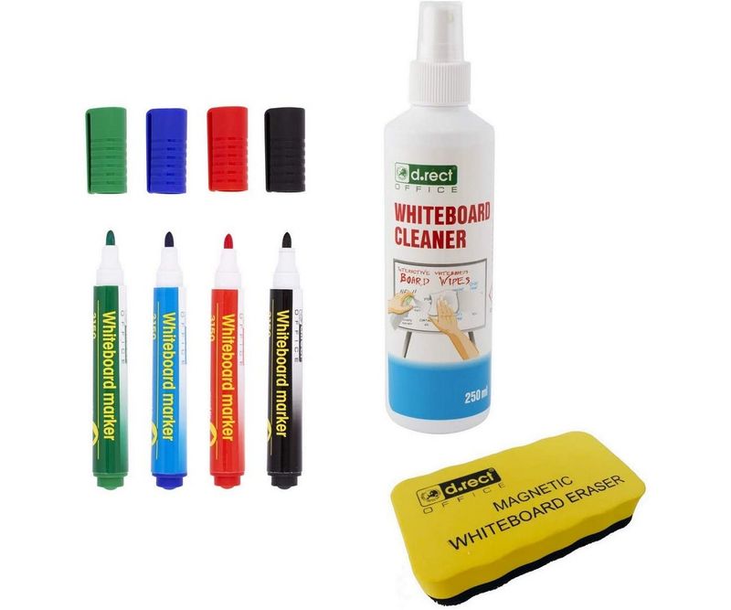 Kit-ul conține: 4 markere pentru tabla, un burete magnetic și un spray pentru tablă de 250 ml.
