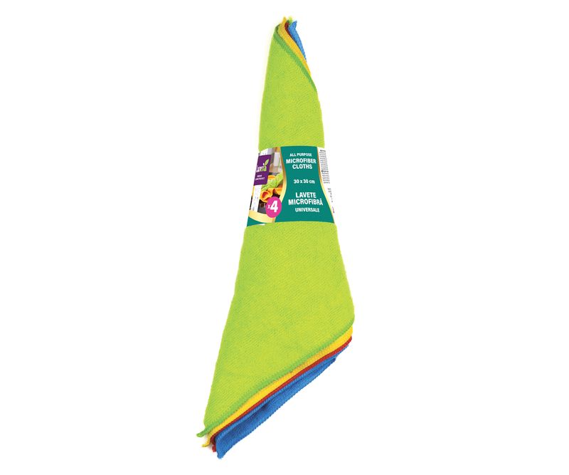 lavetele din microfibră Luxia Extra! Setul conține 4 lavete ultra-absorbante, fiecare în altă culoare (roșu, albastru, galben, verde), ideale pentru curățarea diferitelor suprafețe fără substanțe chimice.
