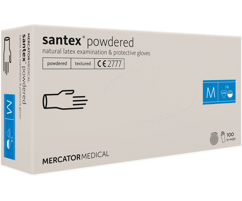 Manusi medicale din latex cu pudra, foarte flexibile. Suprafata exterioara texturata garanteaza o prindere ferma in timpul activitatilor efectuate. Santex® powdered sunt manusi cu pudra care minimizeaza transpiratia. Datorita materiei prime naturale manusile din latex sunt biodegradabile si ecologice. Proteinele cuprinse in latex pot provoca alergie de tip I, de aceea materialul nu este recomandat pentru persoanele cu predispozitii de alergie. Manusile din latex se caracterizeaza prin: flexibilitate ridicata, rezistenta si confort in utilizare, sensibilitate excelenta la atingere, care ofera utilizatorului senzatia de „a doua piele a mainii”.