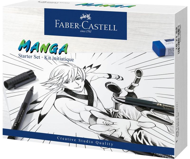 Set manga pentru incepatori ce contine markere Pitt Artist Pen cu tus India. PH-neutru. Cerneala rezistenta la lumina. Rezistent la apa dupa uscare, nu se intinde pe hartie. Pigmenti de cea mai inalta calitate. Contine: 3 linere Pitt Artist Pen cu varf XS de 0.1mm, M de 0.7mm, B varf pensula culoarea 199 negru, 1 creion mecanic TK-Fine 9715 de 0.5mm, o radiera, 12 mine de 0.5mm B, un manechin si brosura cu instructiuni.