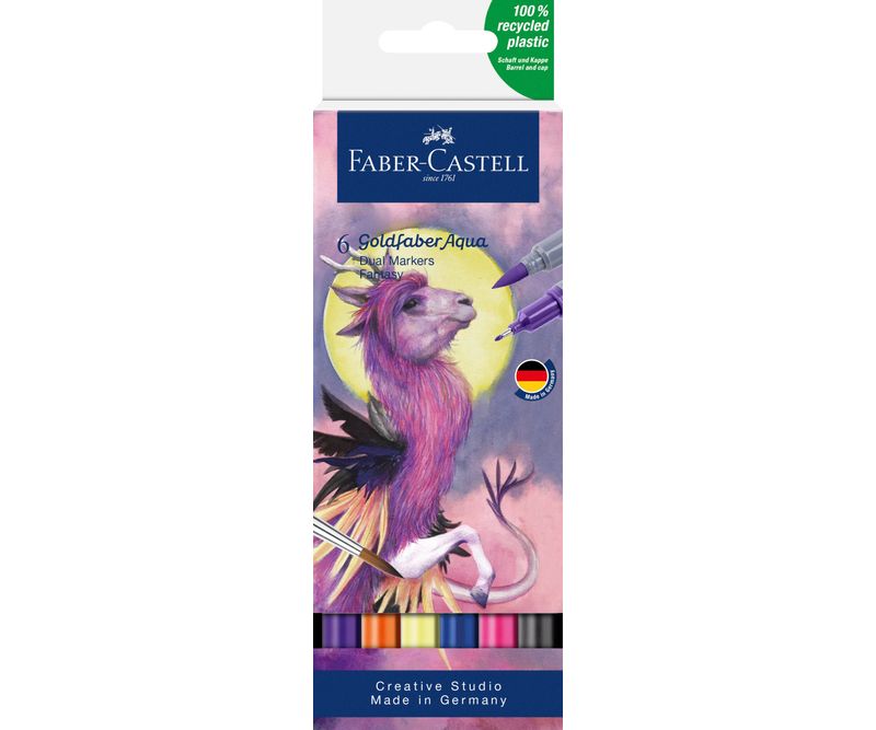 Marker solubil 2 capete Fantasy Gold – Set 6 bucăți Faber-Castell Marker-ele Fantasy Gold Faber-Castell sunt ideale pentru desen, contururi precise și tehnici de acuarelă, oferind culori vibrante și sigure pentru toate vârstele. Caracteristici produs: