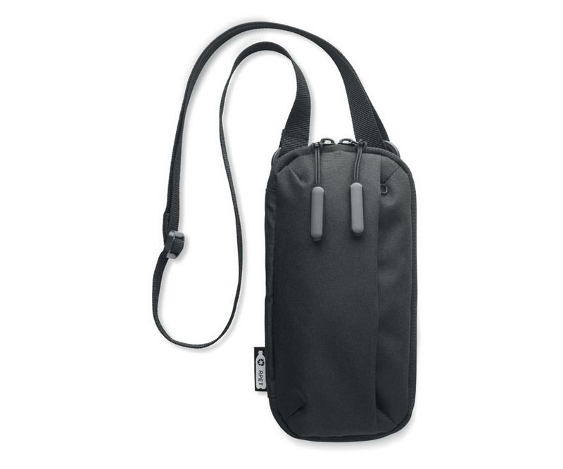 Geanta cross body pentru smartphone din poliester RPET 300D cu curea reglabila. Buzunar frontal si lateral cu fermoar. Compartimentul principal are mai multe buzunare.