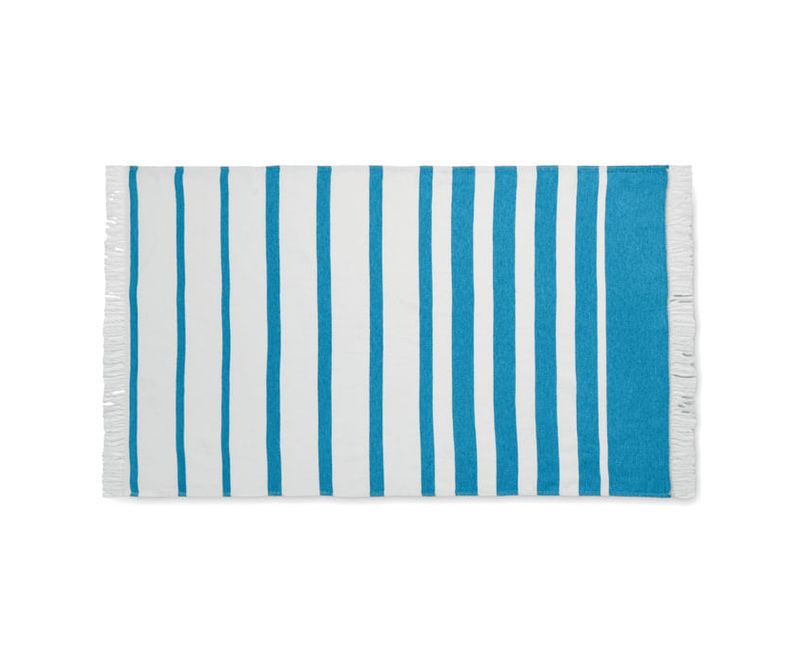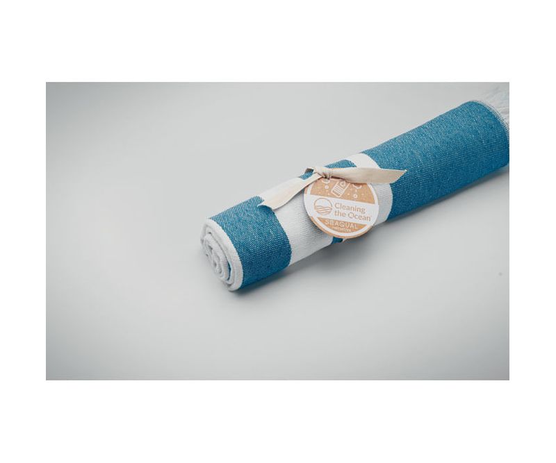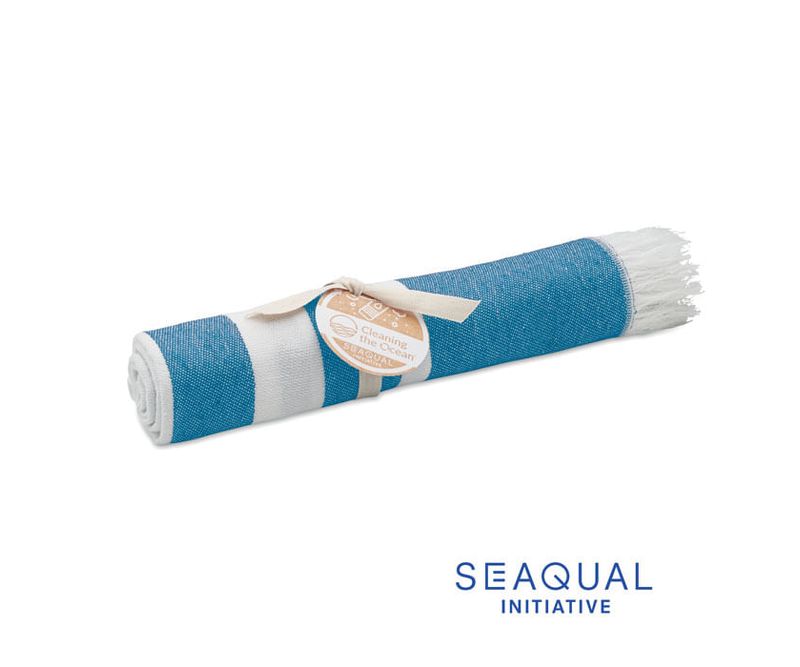 Prosop hamam sau plaja din tesaturi reciclate. 70% bumbac reciclat si 30% poliester reciclat poliester reciclat SEAQUAL® YARN. 300 gr/m². 100x170 cm. SEAQUAL INITIATIVE lucreaza cu operatiunile de curatare a oceanelor din intreaga lume pentru a valorifica deseurile pe care pe care le recupereaza. Fabricat in UE.