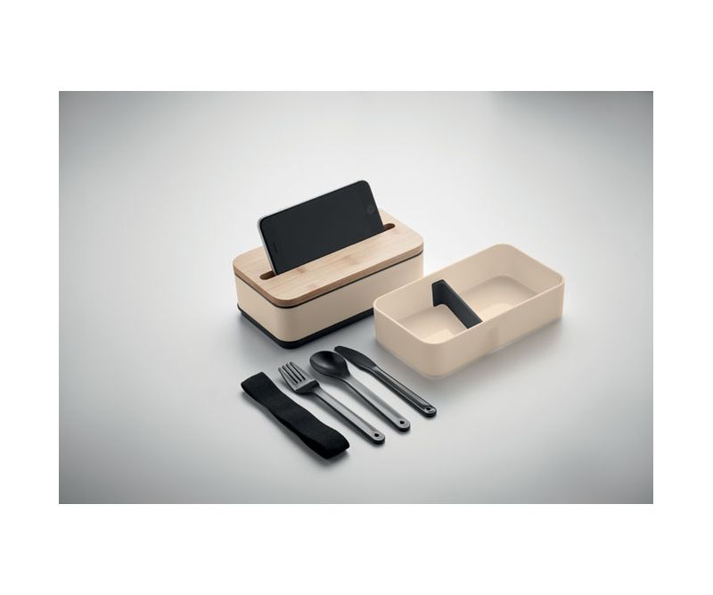 Cutie de pranz cu doua niveluri din PP cu separator detasabil , 3 tacamuri cu banda atasabila din poliester cu capac din bambus. Capacul are o functionalitate de suport pentru telefon. Capacitate: 400 ml (2x). Bambusul este un produs natural, in consecinta pot aparea diferente de culoare, dimensiune sau desen. Fara scurgere.