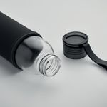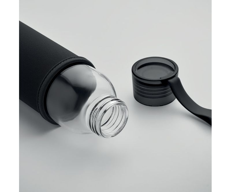 Sticla din sticla reciclata cu husa din neopren si capac din PP cu agatator din silicon. Fara scurgeri. Capacitate: 500 ml.