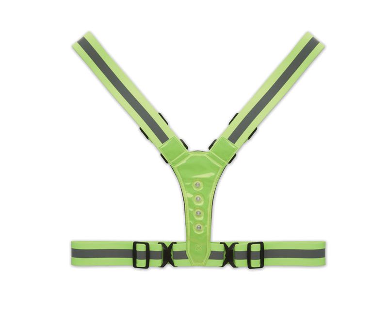 Centura de corp reflectorizanta reglabila la 360° cu 4 LED-uri in fata si 4 LED-uri in spate si dungi argintii. Inclus 2 baterii CR2032. Numai pentru uz promotional.