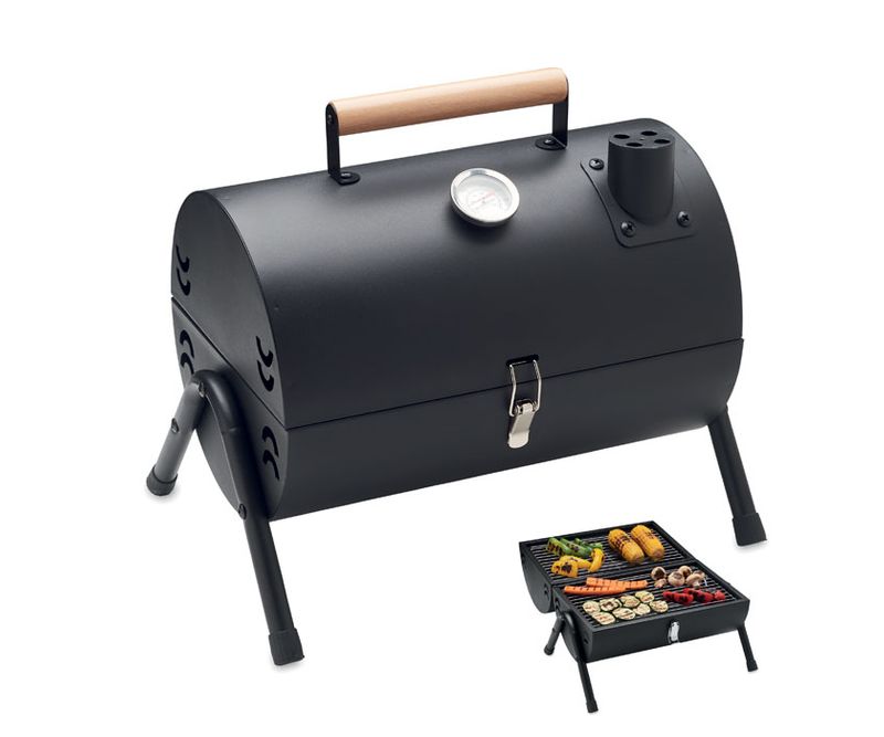 Gratar portabil din fier cu cos de fum si indicator de temperatura. Focar negru. Zavor de blocare si maner de transport din lemn.