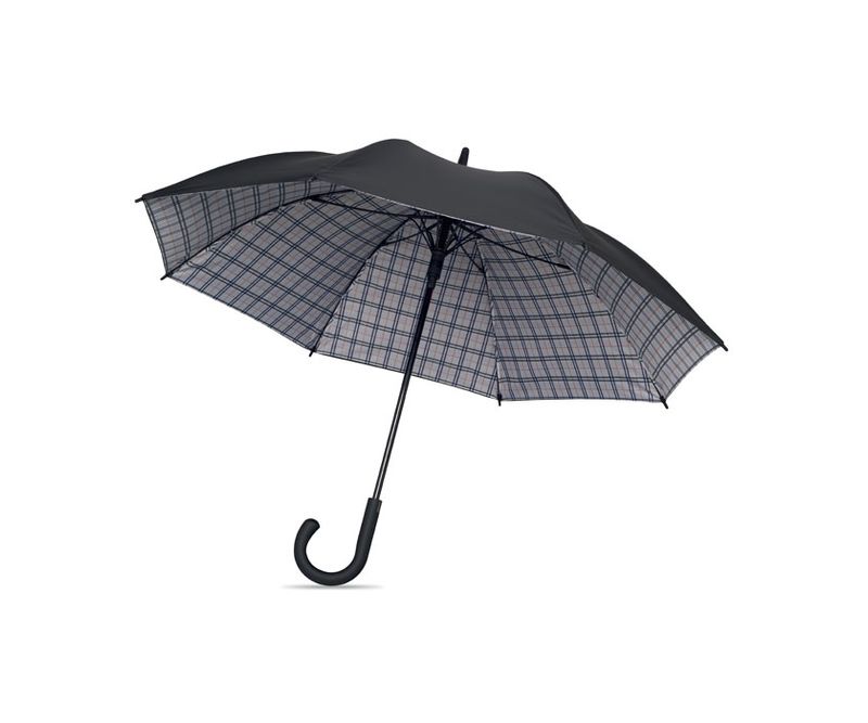 Umbrela 23 inch rezistenta la vant cu deschidere automata, din pongee 190T, cu model interior cu carouri. Cadru din fibra de sticla cu tija placata in negru si varfuri din plastic. Maner curbat cu finisaj din cauciuc. Inchidere manuala.