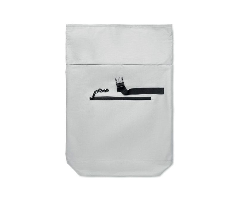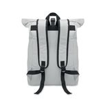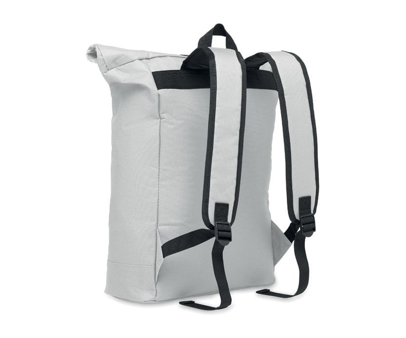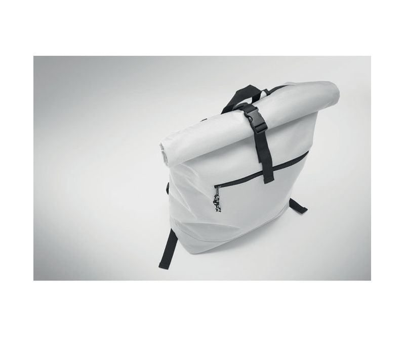 Rucsac rolltop pentru laptop de 15 inch din poliester 600D cu spate captusit si intaritura la baza. Buzunar frontal cu fermoar. Captuseala din 210D.