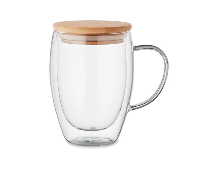 Cana din sticla borosilicata cu perete dublu, cu maner si capac din bambus. Capacitate: 350 ml.