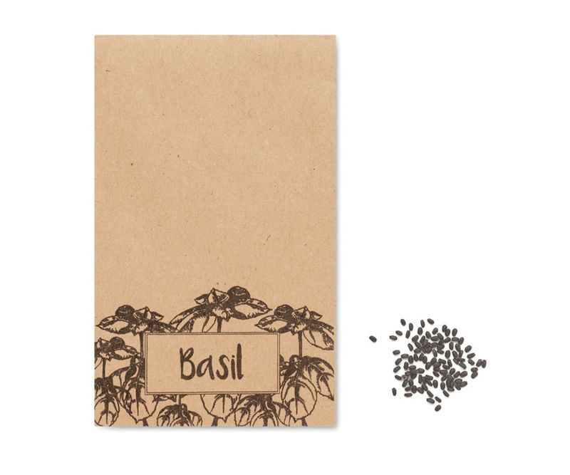 Seminte de busuioc intr-un plic artizanal.