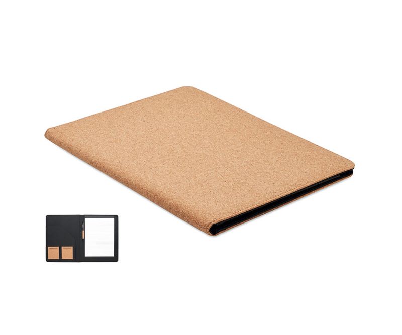 Mapa de conferinta A4 din pluta. Blocnotes A4 reincarcabil. 30 de foi liniate din hartie reciclata. Stilou si suport de pixuri asortate. 2 suporturi pentru carti de vizita si un compartiment mare.