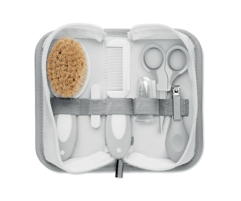 Set de 6 piese pentru ingrijirea copilului. Include: perie de ingrijire delicata, pieptene pentru bebelusi, periuta, pila de unghii, foarfeca de unghii si foarfeca. Prezentat intr-o geanta din poliester 600D.