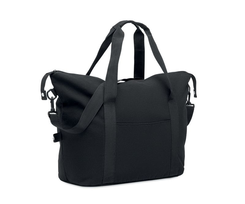 Geanta de weekend din bumbac reciclat si poliester reciclat (70%/30%) cu captuseala din poliester RPET 210D. Are un buzunar frontal, un buzunar spate cu fermoar, o curea de umar detasabila si reglabila si fund captusit. Manson pentru valiza.