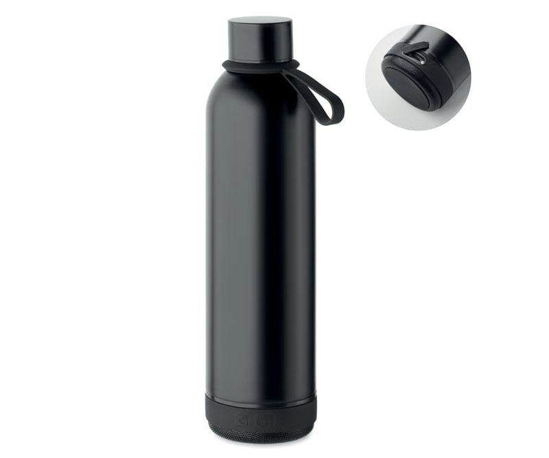 Sticla termo cu perete dublu din otel inoxidabil reciclat (90% otel inoxidabil reciclat si 10% otel inoxidabil) si maner din silicon - difuzor wireless detasabil de 3 W. Capacitate: 500 ml. are o baterie incorporata: 500 mAh. Indepartati difuzorul pentru curatare.