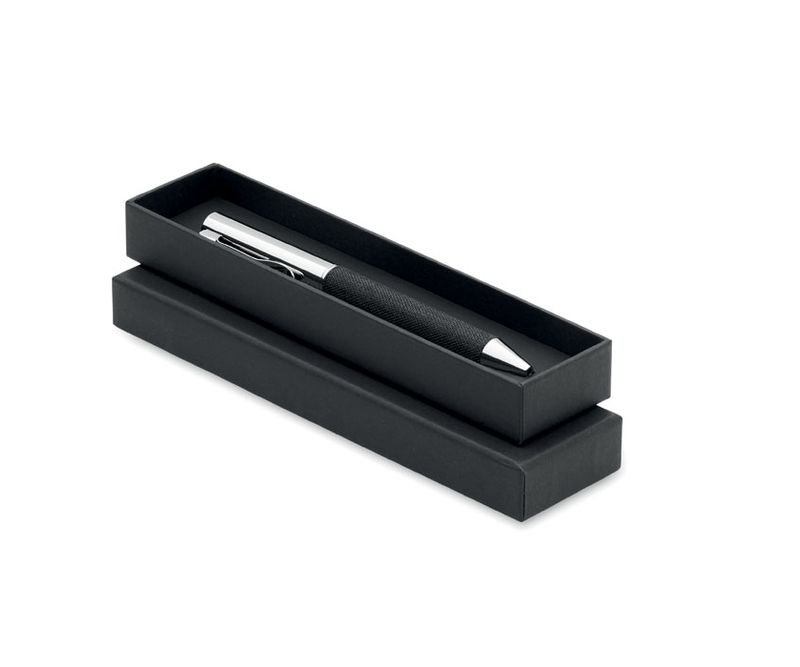 Pix cu bila rotativa din metal cu detaliu din poliester RPET, prezentat in cutie de cadou. Cerneala albastra.