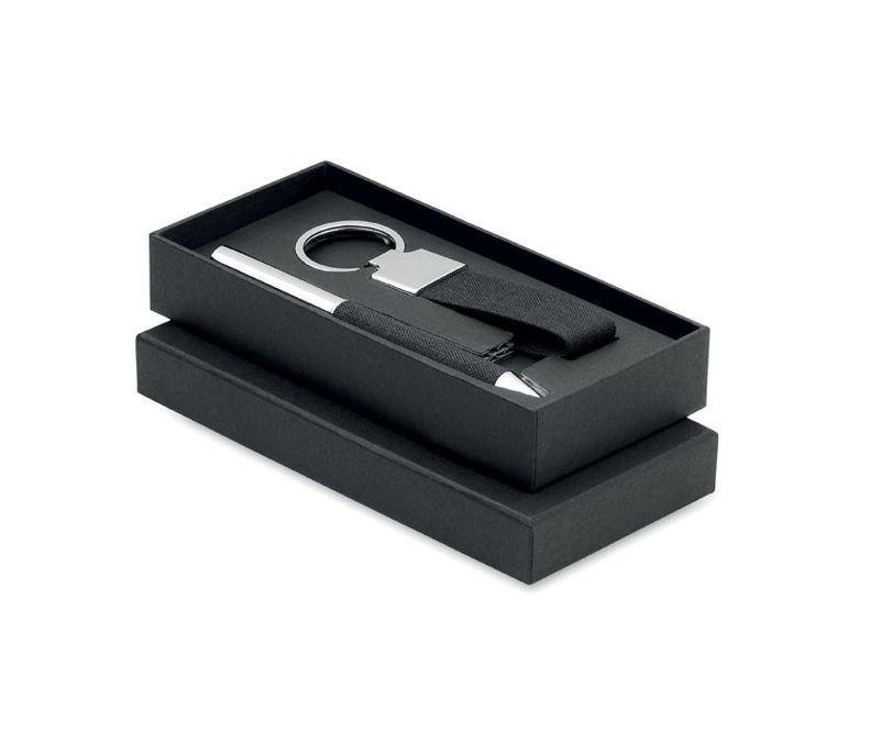 Set 2 piese in cutie de cadou. Inclusiv stilou cu bila rotativa din metal cu detaliu din poliester RPET si breloc de chei din poliester RPET. Cerneala albastra.
