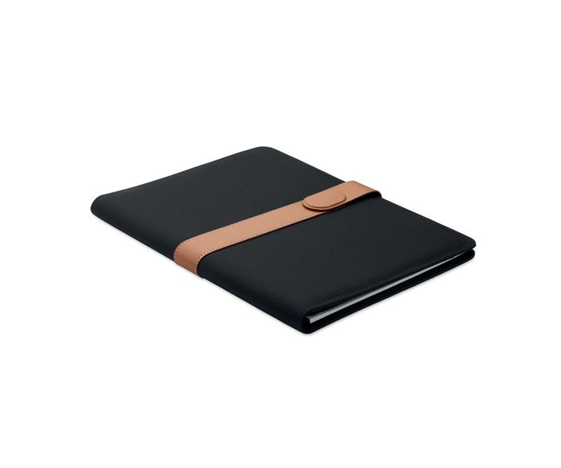 Portofoliu A4 din RPET cu detalii din piele artificiala. Blocul de notite A4 reincarcabil.30 de pagini liniate din hartie reciclata. Suport pentru stilou. 4 suporturi pentru carduri, 3 buzunare mici si un compartiment mare. Inchidere cu curea magnetica. FSC®-certified | FSC MIX , P8.6, FSC-C213206